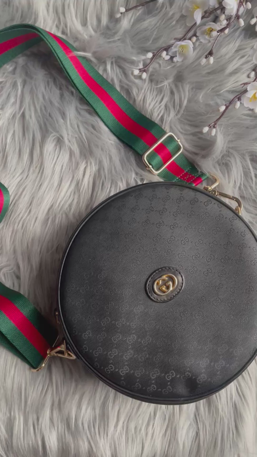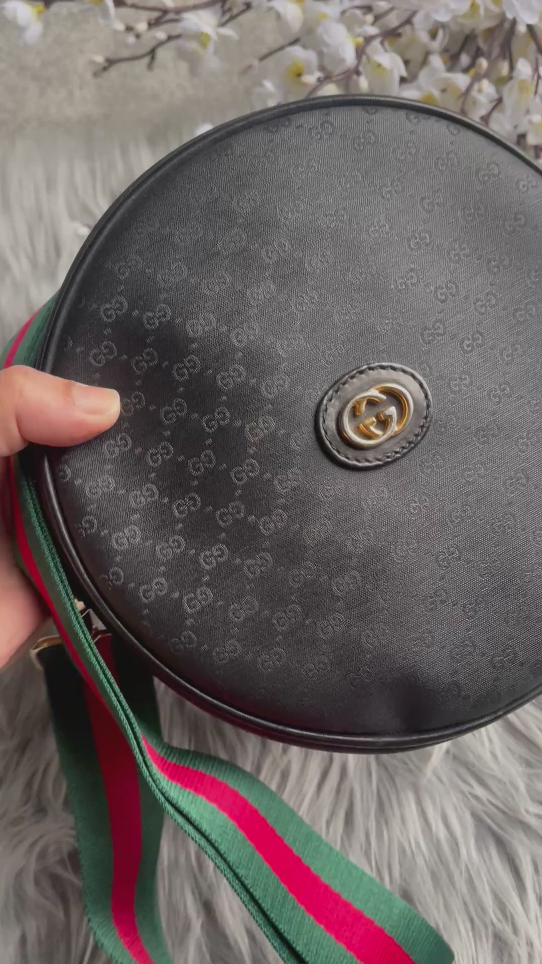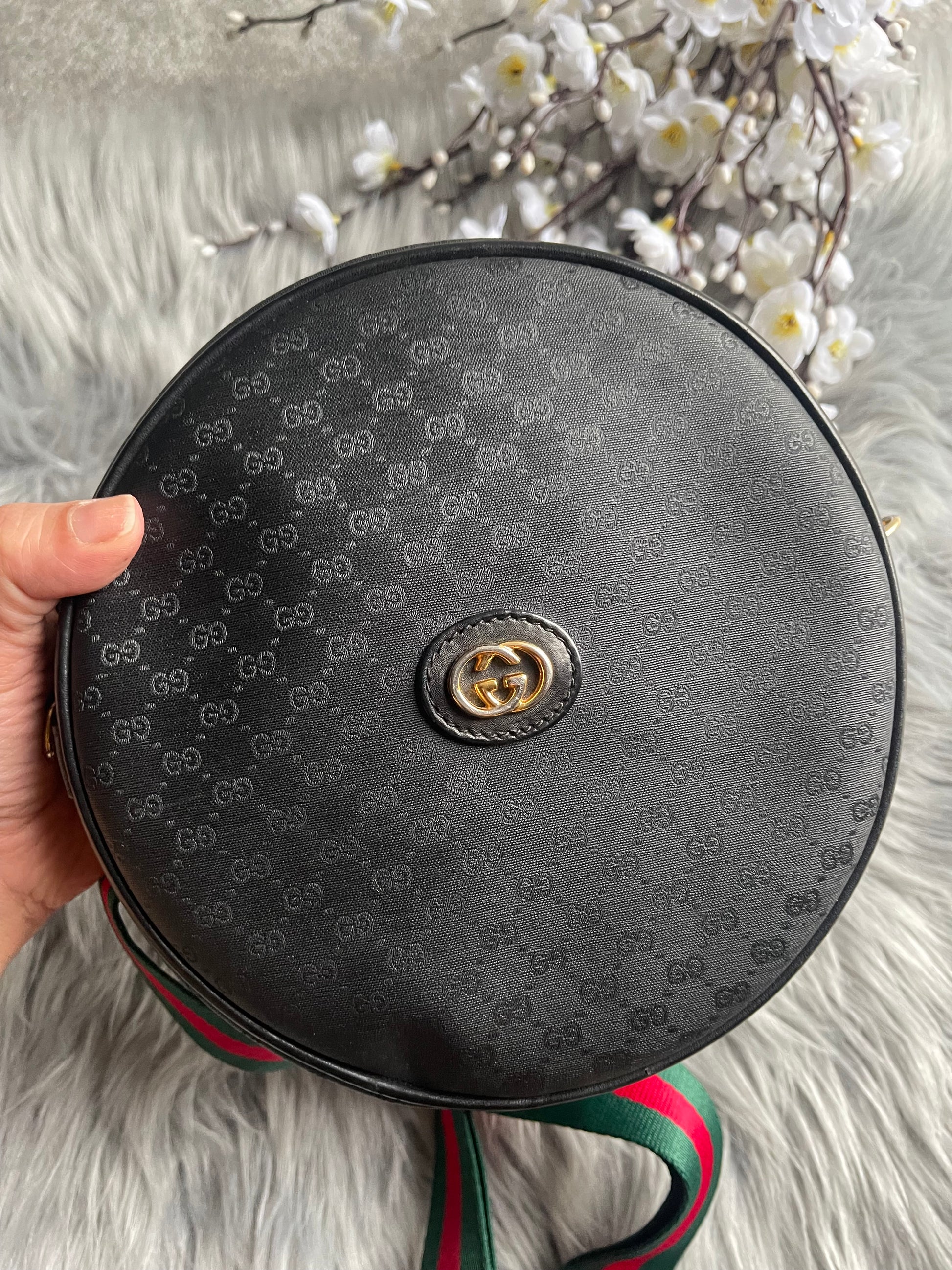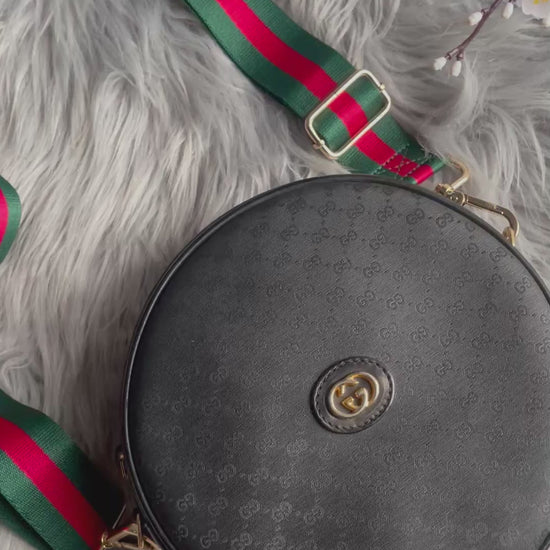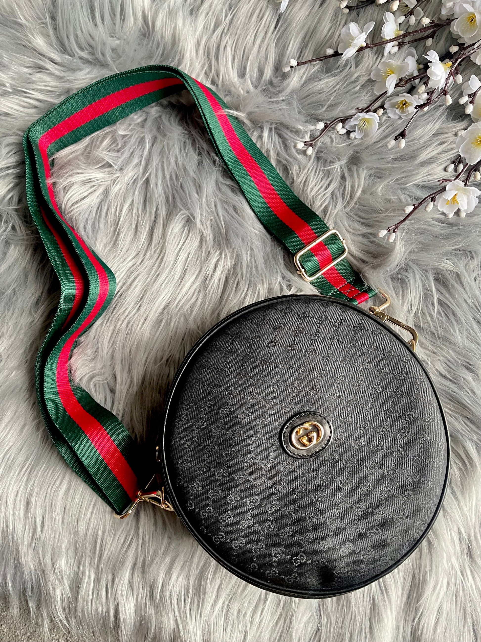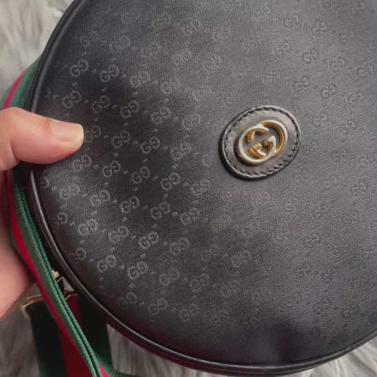 this is a vintage gucci round purse. body is the black coated with tiny black GGs. black piping trim. gold tone hardware.gold tone GG front logo. top width is narrower than bottom and is 2''. the strap is not adjustable. originally meant for the shoulder but you can cross body. i am 5'4'' and crossing it, it sits at my waist. the exterior is in very nice preowned vintage condition. the interior has visible wear with the black lining peeling off. it will need definite repair...the black comes off on hands. there is a zip pocket with the vintage pull and also the gucci tab